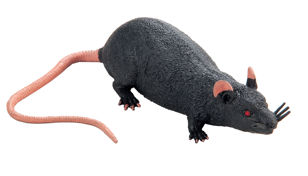 Plastic rat met een akelige blik en rode oogjes. Hoogte 18 cm. Deze schitterend vormgegeven rat, met zijn sterk realistische uiterlijk, is perfect als decorstuk voor bijvoorbeeld een Halloweenparty of een Middeleeuws feest. Echt te vies om aan te raken.