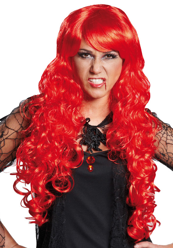 Pruik rood extra lang met krullen en pony. Dat maakt jouw outfit pas echt af deze mooie lange rode krullenpruik met een pony. Het haar glanst en lijkt net echt. Met diverse Themafeest kostuums te combineren.